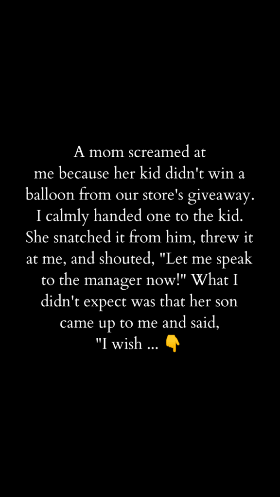 I was working my usual Saturday shift at the discount store when a mom erupted because her son didn’t win a balloon from our giveaway. Calmly, I handed one to the boy, but she snatched it, threw it at me, and demanded the manager. I froze, and then the boy whispered, “I wish you were my mom.” His words struck me harder than the balloon ever could. He couldn’t have been more than seven or eight, and his eyes were big and watery. While his mother raged, I knelt, smiled, and told him it wasn’t his fault. That small connection stayed with me long after the storm passed.